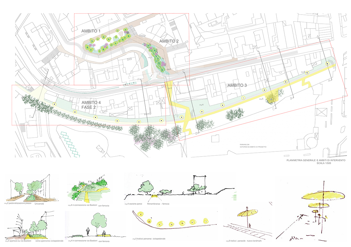 La intervención paisajística propone una estrategia capaz de reconectar los antiguos terrenos del ferrocarril de Brindisi, actualmente sin uso, y el futuro complejo universitario dispuesto a lo largo de la via Federico II de Svevia. Esta conexión va a suponer la introducción de un pulmón verde dentro de la trama urbana, a través de un sistema capilar de peatonalización y revegetación.